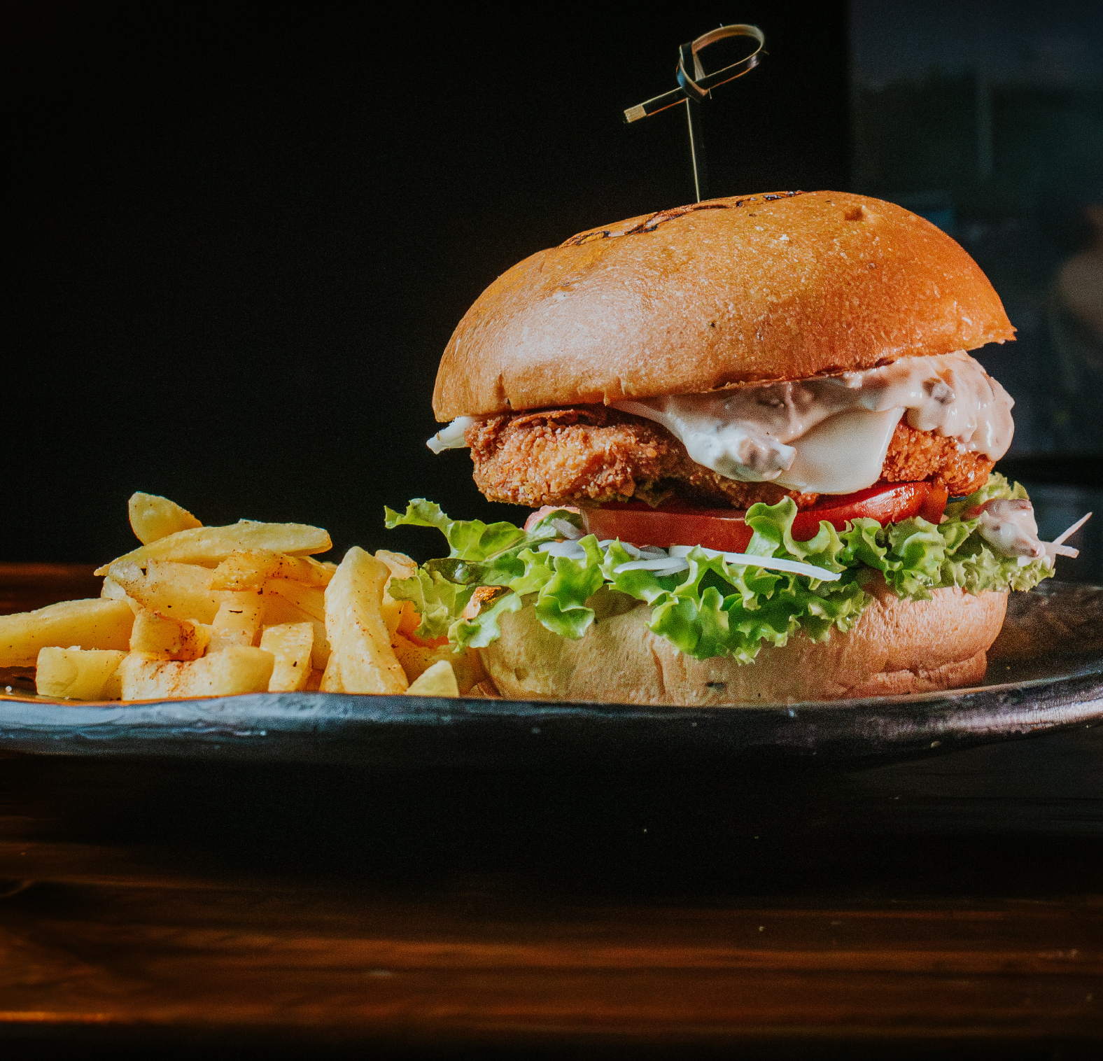 Artisan bread, double meat, curly lettuce, tomato, white onion, pickles,